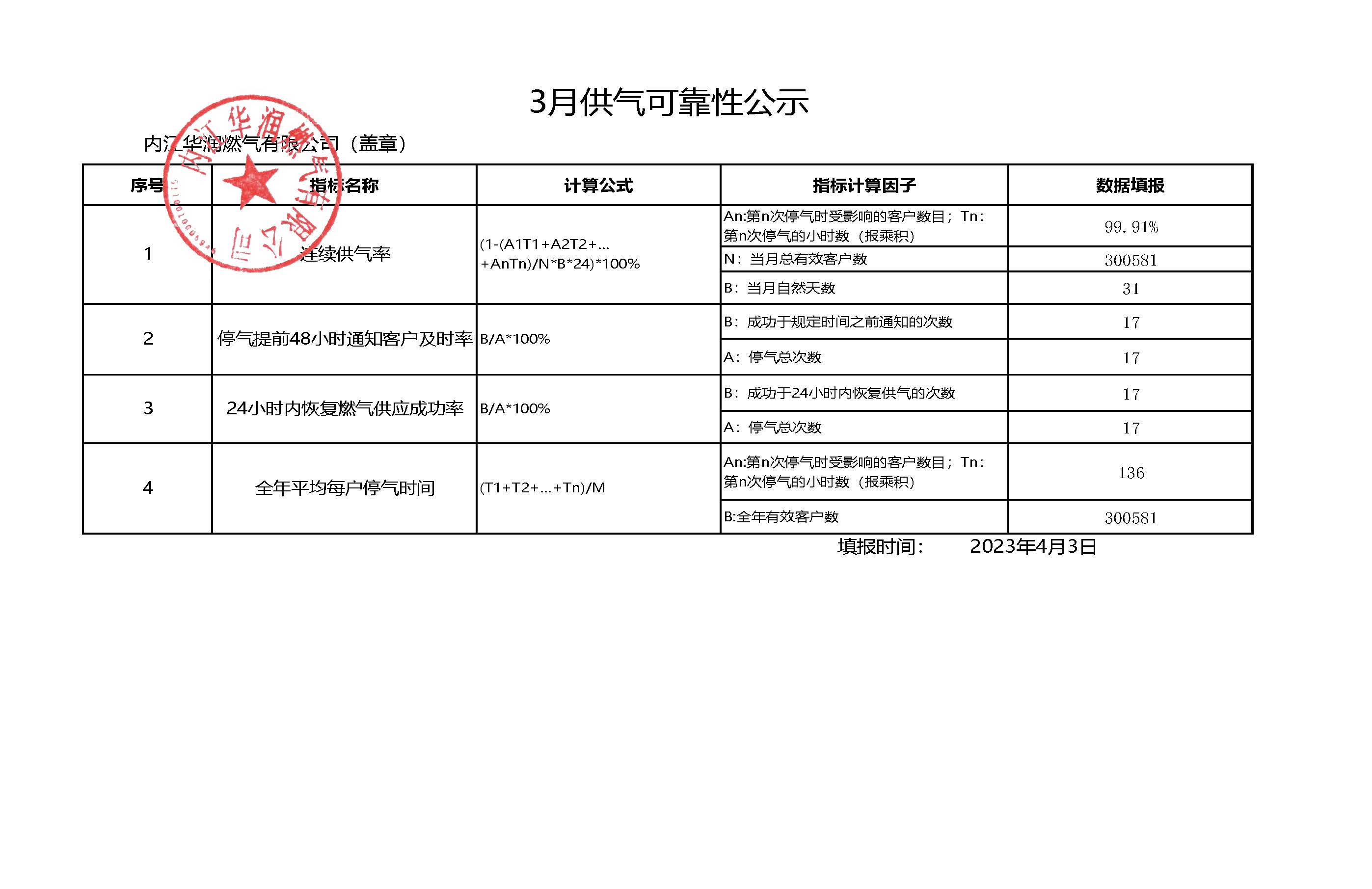 2023年一季度供氣可靠度公示